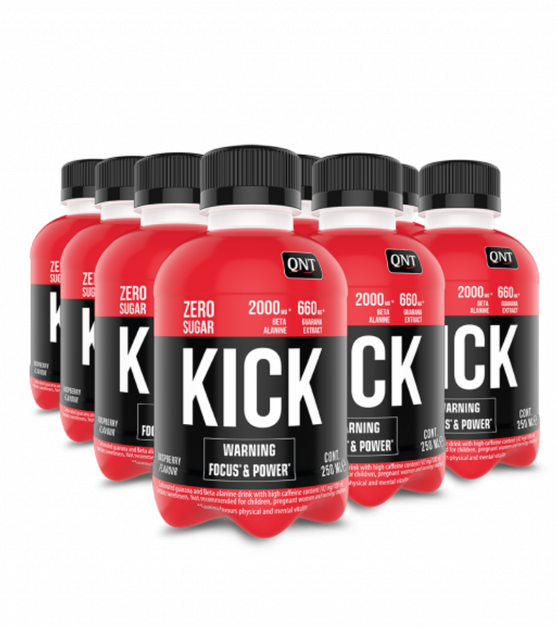 KICK – RASBERRY FLAVOUR (QNT)Complemento alimenticio a base de Extracto de Guaraná, beta alanina y cafeína. Con edulcorantes.Contiene cafeína.