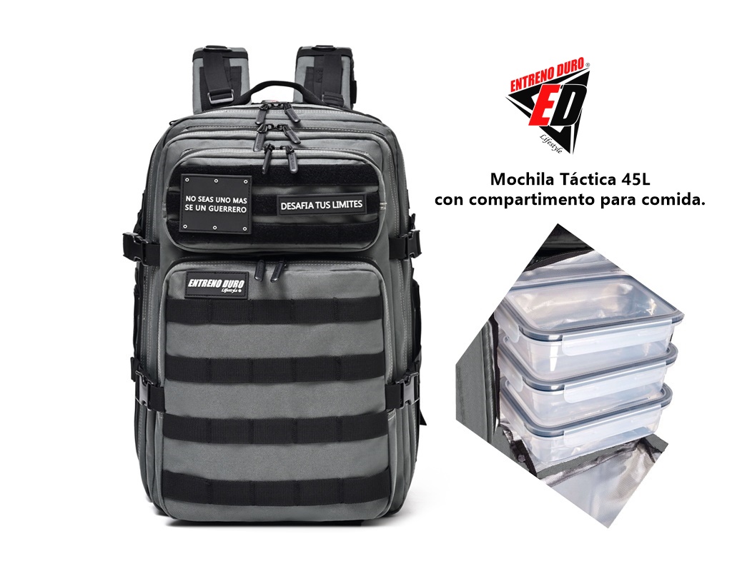 Manteniendo la estética de nuestra Mochila Táctica EntrenoDuro, rediseñamos su funcionalidad interior para que ahora puedas guardar tus comidas con un compartimento más frío y portavasos más grandes. ¡Revolucionando las mochilas para la gestión de comidas!