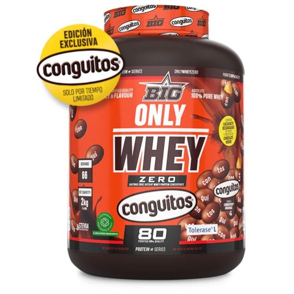 Only Whey Zero Conguitos® 2KG (Big). Nueva proteína de concentrado de suero sin lactosa de BIG®, elaborada con Lacprodan® SP-8011V Instant, la proteína elegida por las mejores marcas internacionales de suplementación deportiva y uno de los mejores concentrados de suero del mercado, y con la novedosa patente Tolerase L-Lactasa®, una formulación con enzimas de lactasa que mejora significativamente la digestión de la lactosa contenida en el suero. Sin duda, un valor añadido que marca una diferencia para la mayoría de consumidores que busca una proteína en polvo de la más alta calidad.