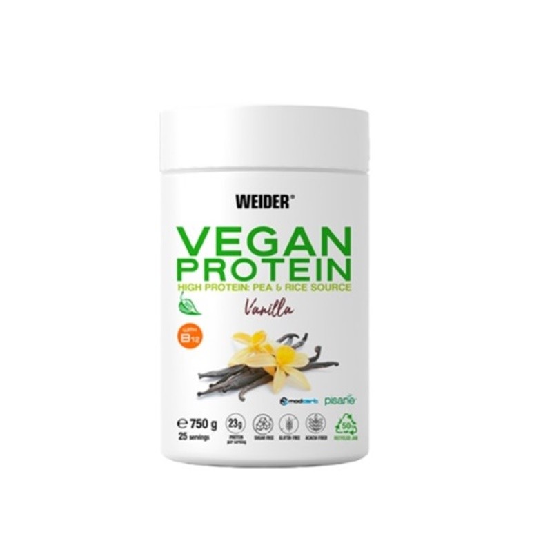 Vegan Protein de Weider es una proteína de origen vegetal procedente del guisante (pisane C9) y del arroz con una cantidad adicional de extractos vegetales y de cereales orgánicos, sin lactosa, sin gluten y sin colesterol. Si quieres incluir en tu dieta una proteína vegana y de una alta calidad y un delicioso sabor, Vegan Protein es la proteína que estabas buscando.